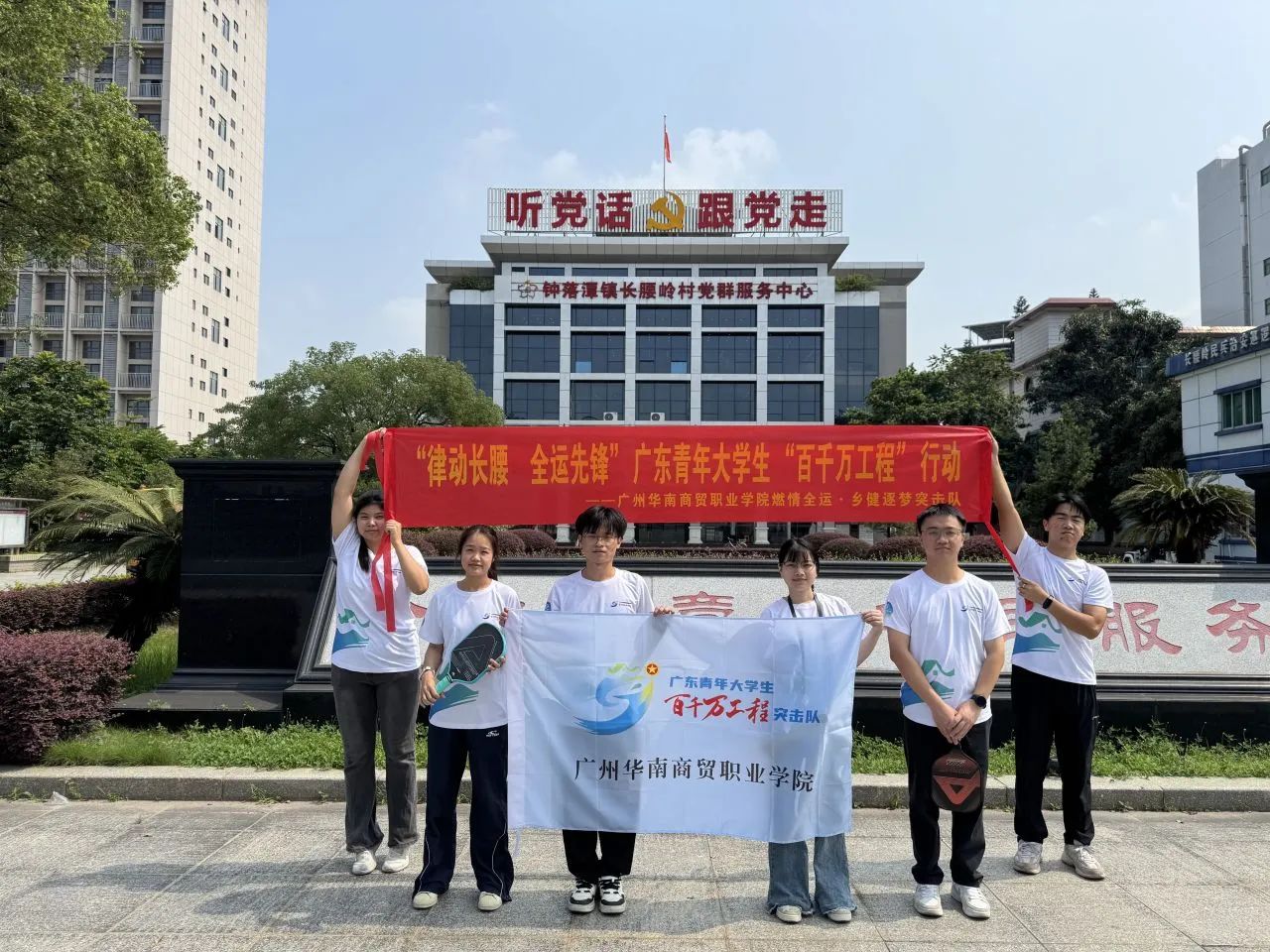 清晨,阳光洒满广场,队旗随风轻扬。广州华南商贸职业学院人文与教育学院“燃情全运•乡健逐梦”突击队在长腰岭村党群服务中心前整装集结,正式开启“百千万工程”行动--匹克球体育人才培养活动的第一天。