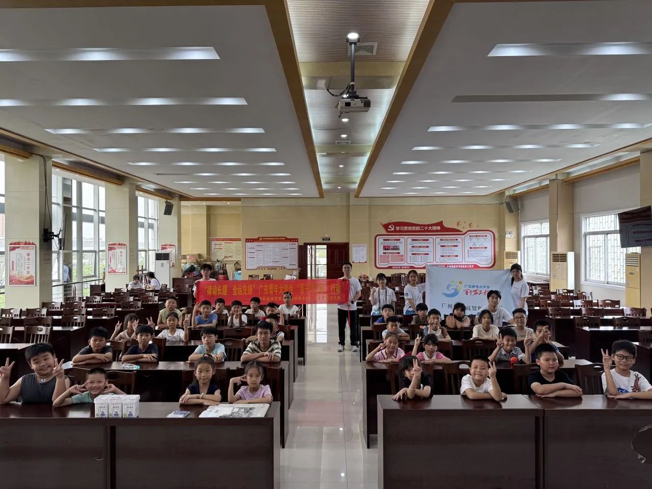 红色横幅在阳光下格外醒目,实践队成员与带队老师曾仪姿老师在此合影,定格下这份属于盛夏的庄重与热忱。