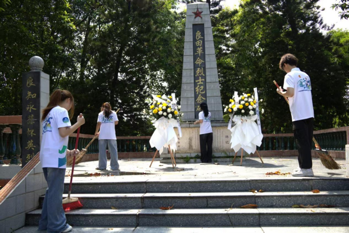 我们中的组员讲述起碑后记载的烈士事迹:“1950年,6位征粮建政工作组同志在良田村遭土匪袭击壮烈牺牲……” 队员们一边聆听烽火岁月的故事,一边将敬意融入每一个擦拭的动作中。当斑驳的碑文在指尖下重焕清晰,历史的回响仿佛与青年的呼吸共振 —— 清扫的是墓碑的尘埃,传承的是永不褪色的精神丰碑。