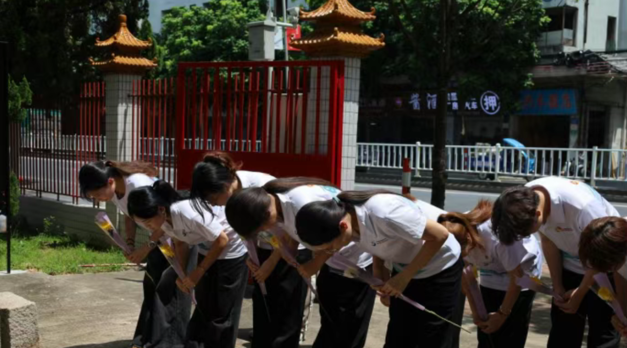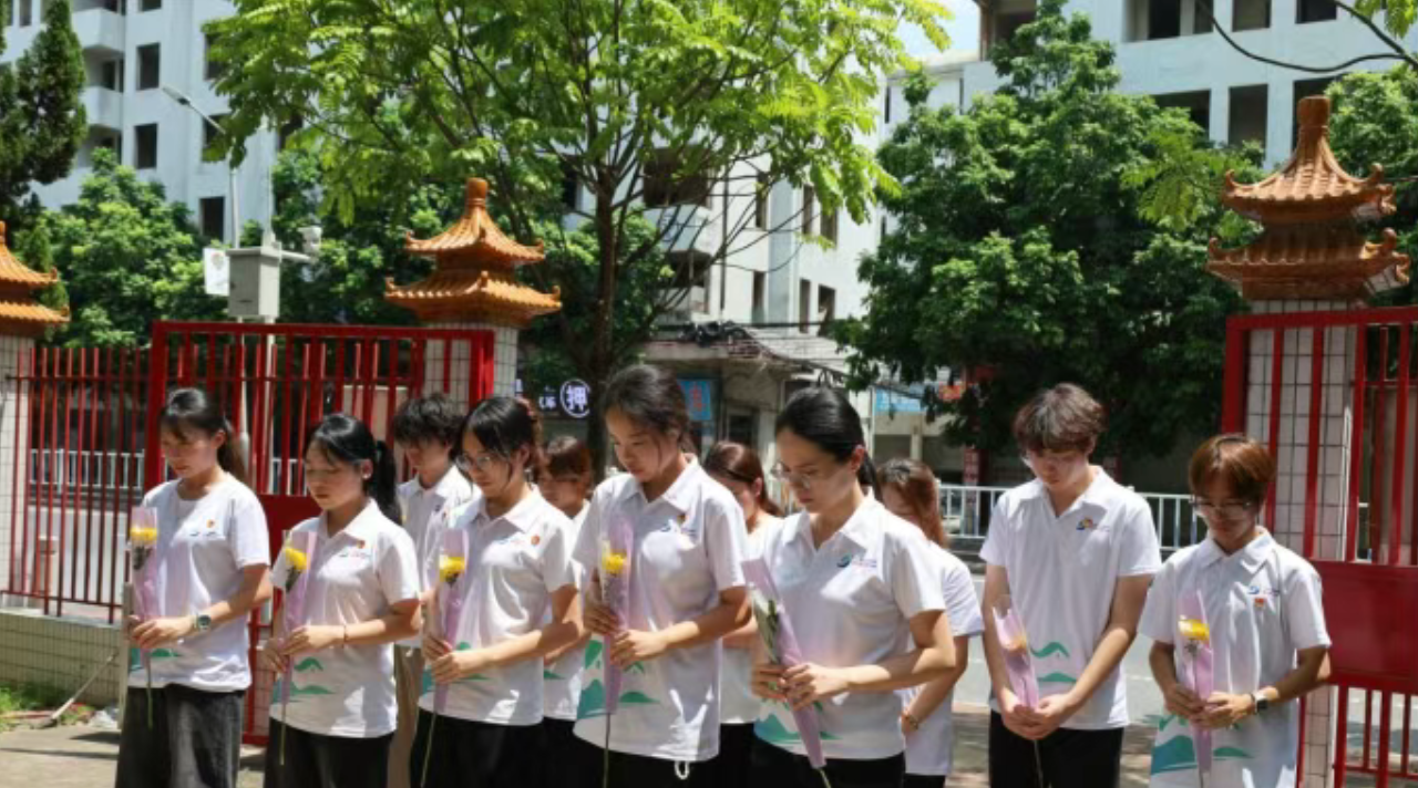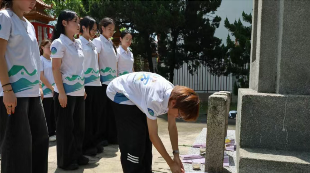 实践队在纪念碑前举行悼念仪式。全体成员默哀一分钟后,依次向烈士墓碑敬献鲜花,并行三鞠躬礼。队员们还擦拭了墓碑灰尘,清理了周边杂物,动作轻缓而郑重,每一处擦拭都饱含着对先烈的敬意,每一次弯腰清理都传递着对历史的珍视。