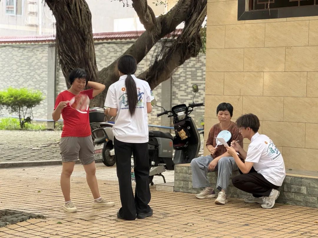 随后,实践队在当地进行问卷调研,队员们分组深入公园、村落街巷,与当地居民进行交流。有的队员在公园里耐心的与村民进行交流,有的在给一些长者讲述问卷的内容。