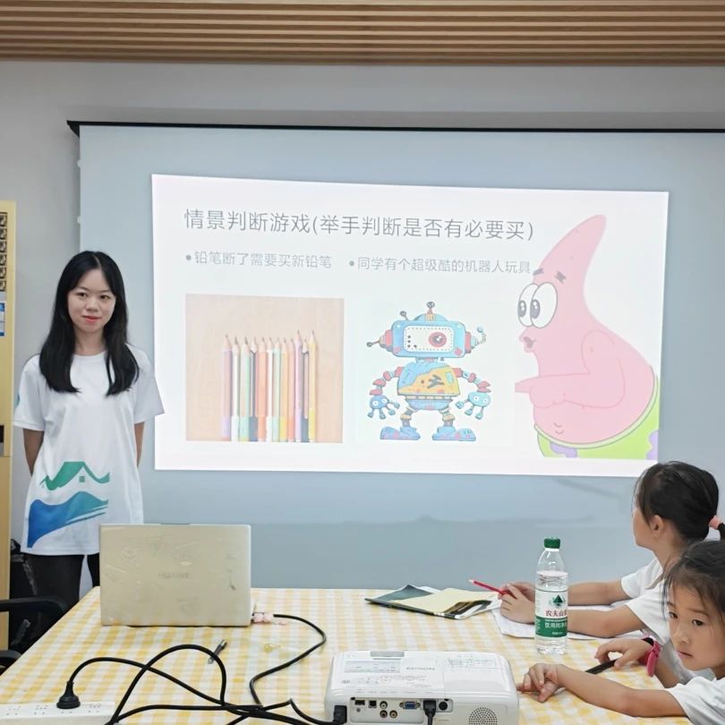 随后,关怀长兴先锋队的成员们为小朋友们带来了一场生动的经济小课堂。聚焦“必需品”与“非必需品”的概念,队员们通过贴近生活的实例和趣味十足的互动小游戏,引导孩子们思考日常物品的价值与需求关系。在轻松愉快的氛围中,孩子们积极参与讨论和游戏,对供给关系有了初步的认识,提升了基本的财商素养。