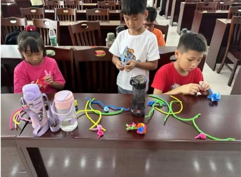 活动过半,乡野间的故事愈发动人。在今天的活动中,扭扭棒手工课成了孩子们的最爱。彩色的扭扭棒在指尖弯折、缠绕,转眼变成蝴蝶、花朵、小动物。志愿者钟禧彤同学手把手教着技法,孩子们发挥想象,创造出独一无二的作品。小小的扭扭棒,连接起耐心与创意,也串联起欢笑与陪伴。当孩子们举着自己的“杰作”炫耀时,眼里的光比彩虹还亮——这不仅是手工课,更是用色彩与巧思,为乡村童年添上生动一笔。