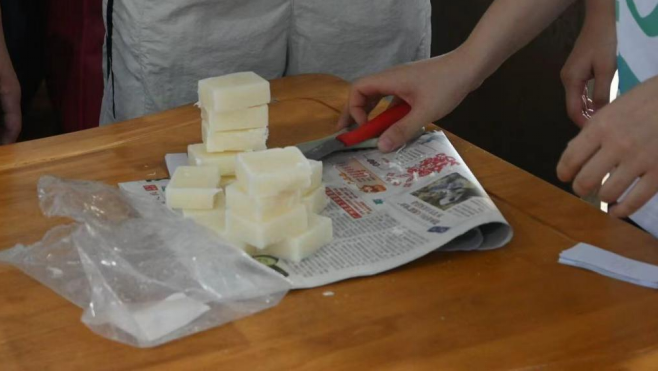 融化完成后,关键的注意事项来了。队员们着重强调:“白蜡和植物油的混合液必须放凉到六十摄氏度左右才能加入薄荷精油。如果温度太高,薄荷精油的有效成分会挥发;温度太低,又不容易混合均匀。大家一定要记住这个要点!”为了准确把控温度,队员们拿出了温度计进行测量,并向大家展示如何读取数值。在等待降温的过程中,队员们与老人、小孩亲切交流,解答他们的疑问,现场氛围轻松又温馨。