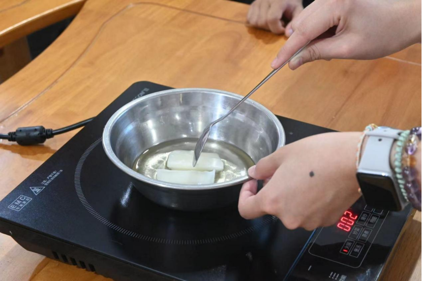 制作环节正式开始,队员先将适量植物油倒入小锅中,开启小火慢慢加热。“小朋友们,加热的时候可不能靠太近,小心被烫到哦!”队员一边操作,一边耐心叮嘱。待植物油微微温热,加入白蜡,并不停搅拌,直到白蜡完全融化,与植物油充分融合。这期间,队员们还向大家介绍:“白蜡的融化需要一些时间,搅拌的时候要均匀,这样做出来的软膏质地才会细腻。”