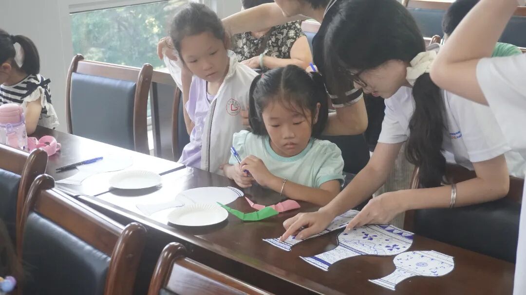 随后,队员们为在场的小朋友们分发花瓶模型和一次性纸盘,接过绘画材料的小朋友们眼里充满好奇与期待,迫不及待地开始在花瓶模型和一次性纸盘上进行创作,小朋友们握着画笔的小手,虽然有些微微颤抖,但眼神中却充满了创作的热情。有的孩子用稚嫩的线条,一笔一划地勾勒出缠枝莲纹,线条虽然不够流畅,转折处也有些生硬,却蕴含着他们对这种传统花纹的独特理解。
