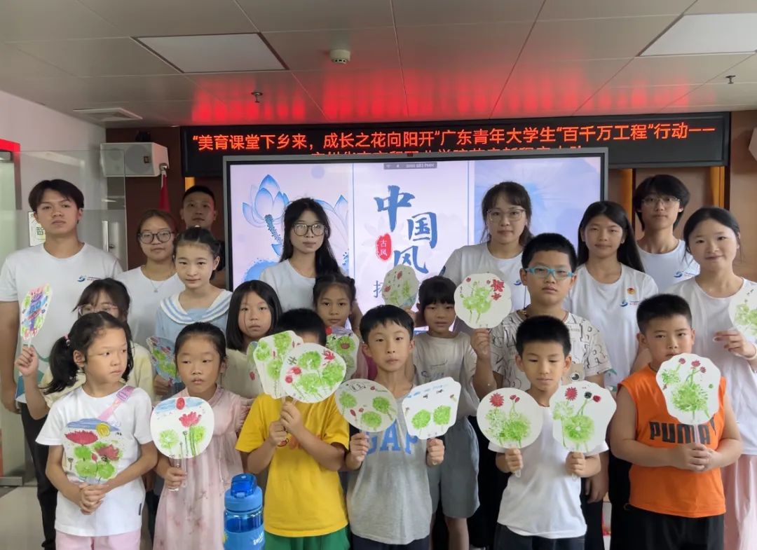 任课老师曾钰萱举着塑料袋和扇子笑着问孩子们:“这塑料袋能和纸扇变成什么神器?” 孩子们眼睛一亮凑上前。她指尖蘸颜料在袋面晕开,翠绿如水滴蔓延。将塑料袋轻覆扇面按压,掀起瞬间,栩栩如生的荷叶跃然扇上,绿意如荷塘涟漪。孩子们欢呼举手,争着亲手绘画夏日荷塘。