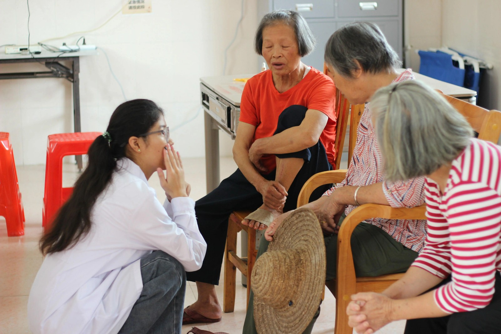 队员们穿梭在华坑村的乡间小路,入户为老人测血糖、量血压。他们用方言与老人唠家常,解答健康困惑,拉近彼此距离。测量时,队员轻卷老人衣袖、指尖采血,边记录数据边叮嘱注意事项,细碎举动中满是暖意。遇到关节痛的老人,队员便取艾灸盒施灸,艾烟袅袅间,不仅驱散病痛,更慰藉了老人的孤独。