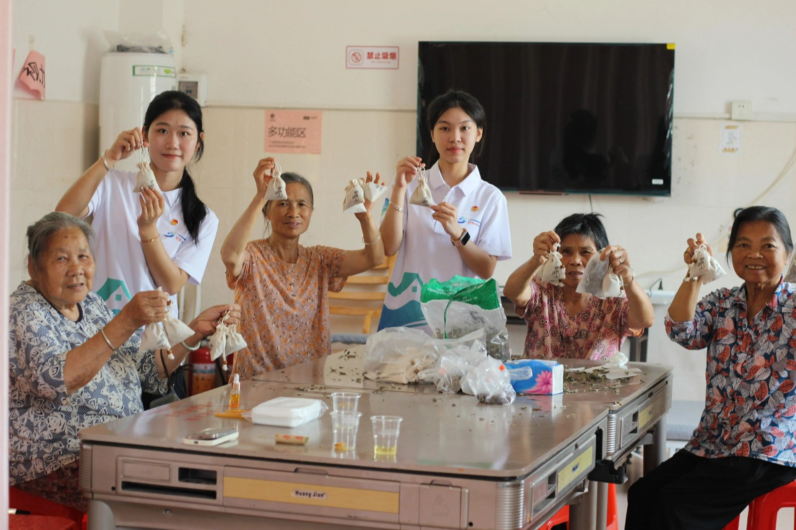 活动中,青年团还与村民共同制作药膳与驱蚊香囊。烹煮药膳时,猪骨、茯苓、山药等食材次第入锅,熬出温润汤汁;煮健脾花茶时,花瓣与药草在沸水中舒展,茶香四溢。制作驱蚊香囊环节,队员们邀请老人围坐,教大家用艾叶、丁香等材料制作,阿婆们握着成品,脸上笑意与艾草清香交织。