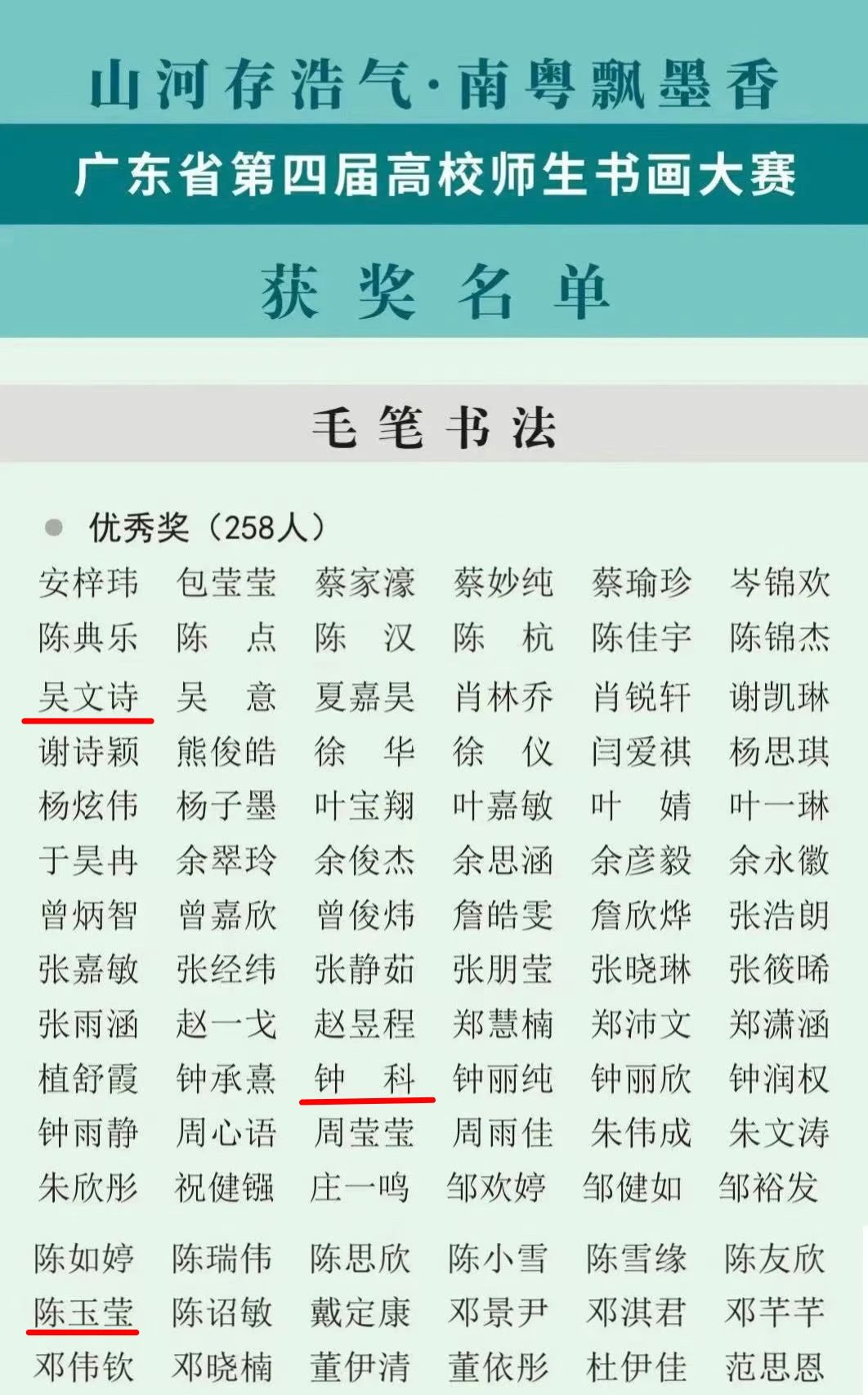 为弘扬抗战精神展现民族气节,激发青年学子爱国热情,增强民族文化自豪感和责任感。2025年7月08日,广东省硬笔书法协会公布了广东省第四届高校师生书画大赛获奖名单,我校精心组织学生参赛,并在激烈的竞争中斩获佳绩。其中卢广老师、潘媚老师被评为优秀指导老师,我校荣获优秀组织奖;罗桂昌获硬笔书法组二等奖,胡佳、蓝可盈、李喆、刘玉梅、钟科获硬笔书法组优秀奖;吴文诗、钟科、陈玉莹获毛笔书法组优秀奖;总参赛9人获奖8人!