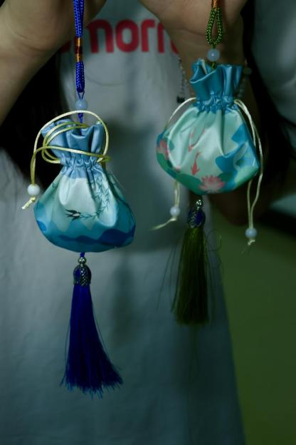 香囊区弥漫中药清香。其历史可溯至先秦,兼具驱虫保健与传情功能。桌上薰衣草、小茴香等药材整齐摆放,成员按喜好装袋。小巧斑斓的香囊里,满是民俗温情,佩戴于身,便将古老祝福随身携带。