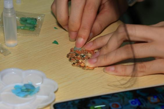螺钿工艺区贝壳光影流转。这项商周技艺以螺蚌壳为材,经打磨雕刻镶嵌器物,曾为宫廷钟爱。成员将贝壳切成细片,在素器上拼贴花鸟山水,天然虹彩与底色辉映,让千年贝雕在现代指尖重绽华彩。