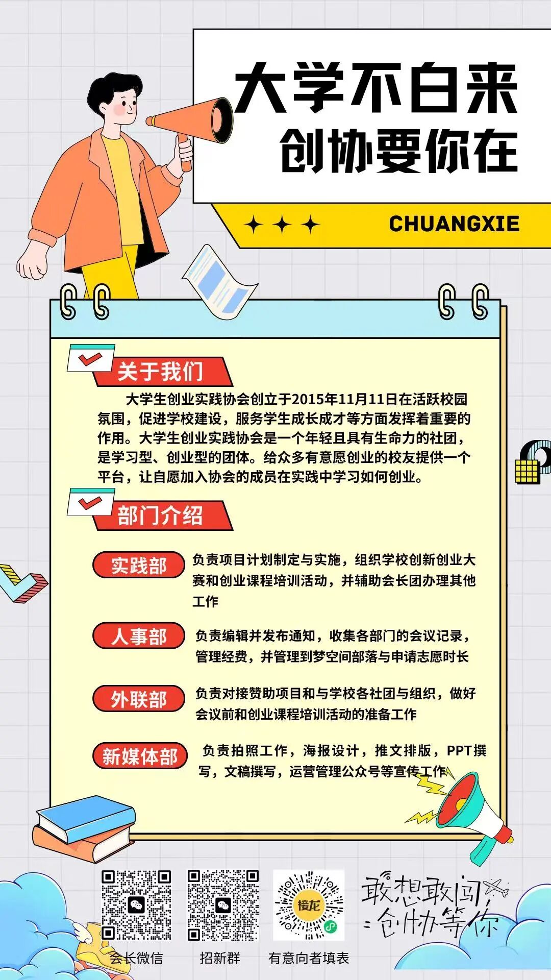 现在,大学生创协实践协会向你敞开怀抱,期待你的加入!