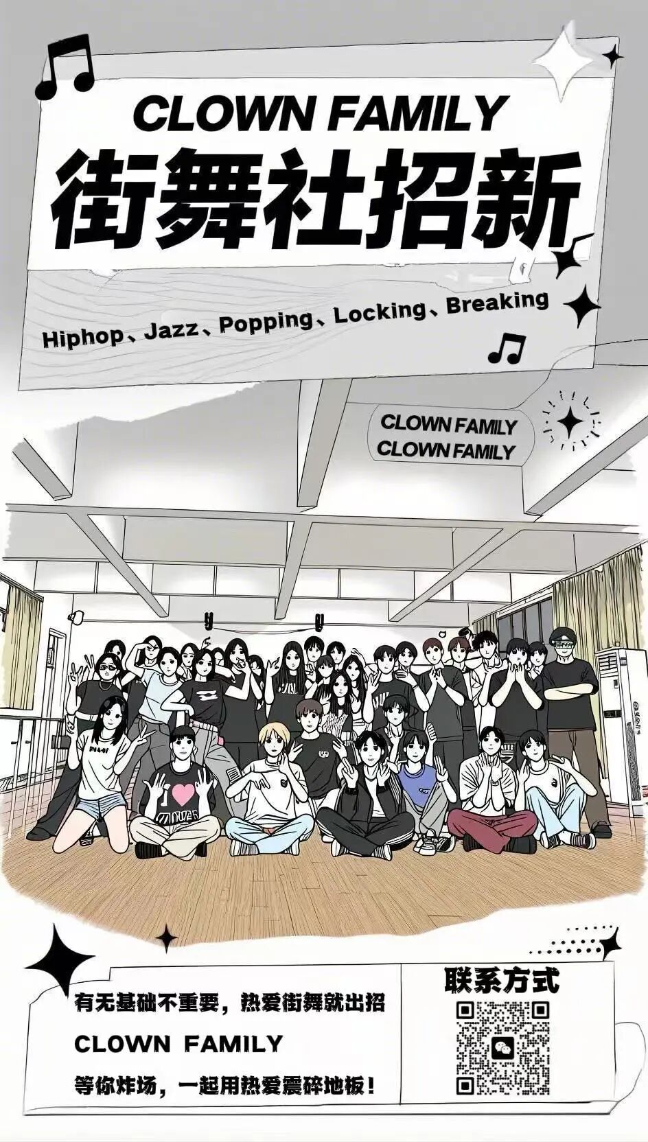 这里有技巧集训时,大家专注练习、互相指导的身影;有主题编舞时,思维碰撞、灵感迸发的时刻;有校园快闪时,路人被我们的舞蹈吸引、纷纷驻足喝彩的场景;更有在各类比赛舞台上,我们自信展示、赢得掌声与荣誉的精彩瞬间……无论你是想从街舞小白成长为舞者,还是想和伙伴们一起享受街舞的乐趣,都能在Clown Family街舞社找到属于自己的精彩!