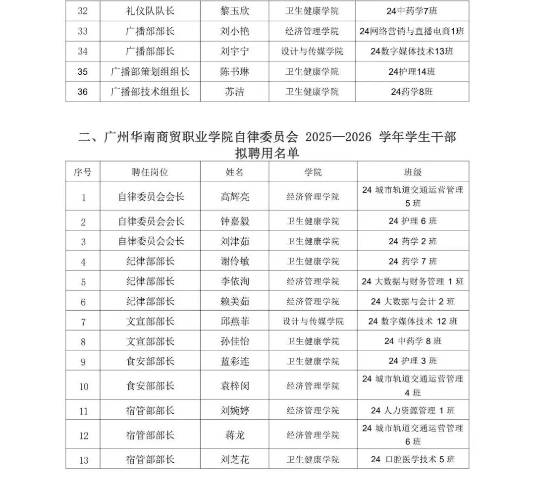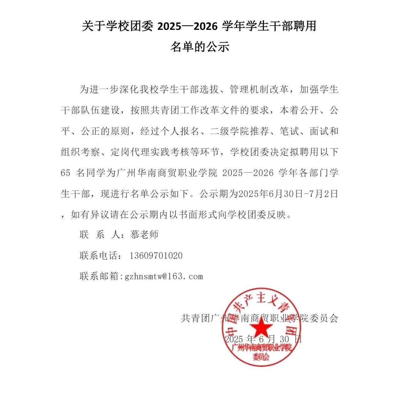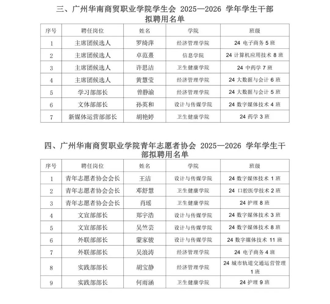 关于学校团委 2025—2026 学年学生干部聘用名单的公示