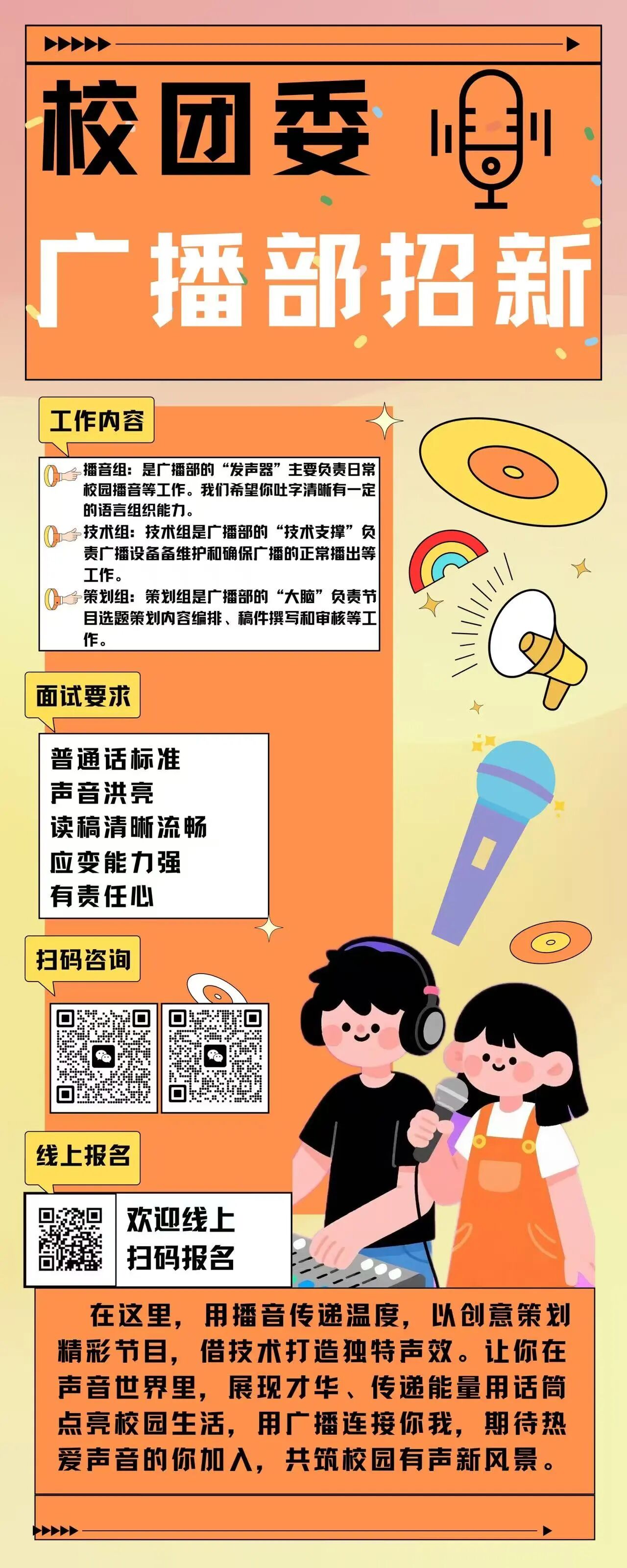 校团委此前推出的三大部门招新已引发不少同学关注,今日起,招新活动持续推进,正式解锁剩余四大特色 “人设”,首个人设 ——“校园声控‘金话筒’” 率先亮相,诚邀热爱声音的同学加入,找到适配自己的校园 “团” 位。
