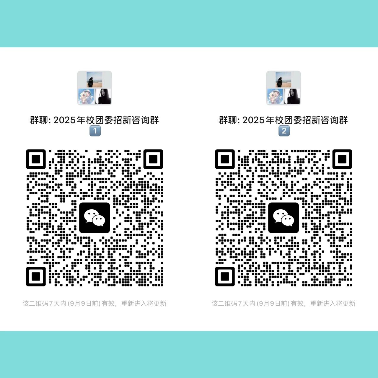 有意者可速选心仪部门、锁定专属 “人设”,扫描 2025 年校团委招新咨询群二维码(9 月 9 日前有效)了解详情。