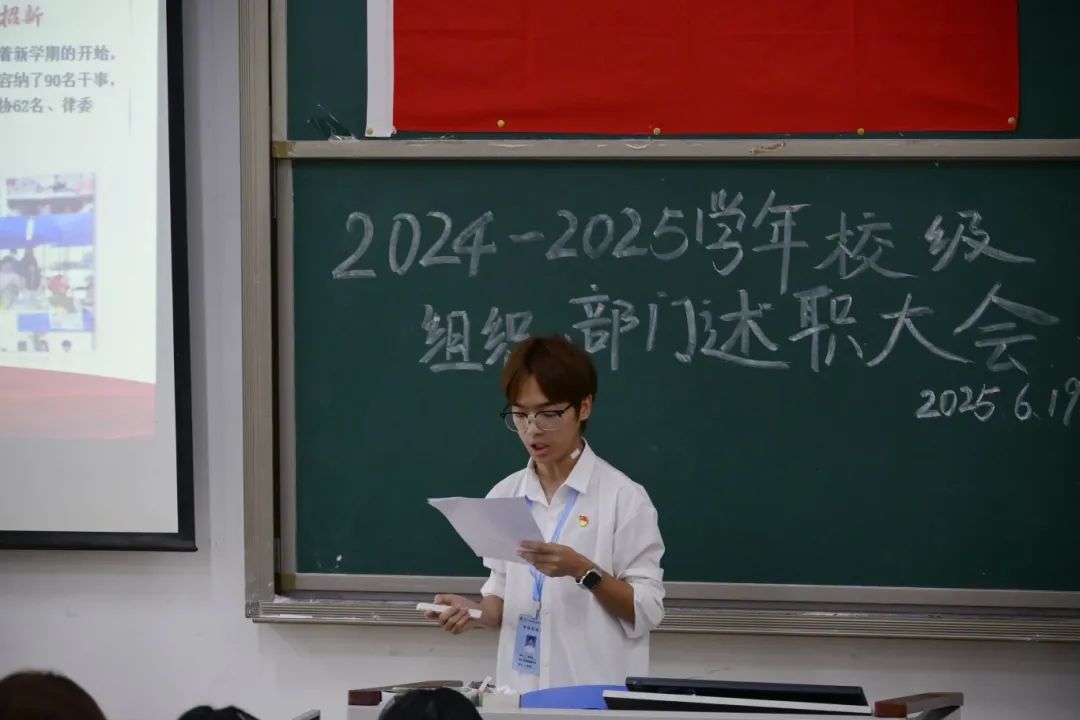 为全面总结各组织、部门过去一年工作成效,梳理成长轨迹,提升学生干部综合素养,推动团学工作规范化、高效化发展,2024-2025学年校级组织、部门述职大会于2025年6月19日晚在教学楼1-104教室圆满召开。校团委书记李丽珠、校团委副书记慕朝宁、校团委老师郭曼、卢慧芳、李芷宜出席会议,各组织、部门干部和干事共同参与。本次大会由黎玉欣同学主持。