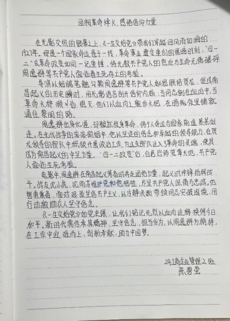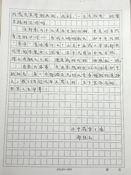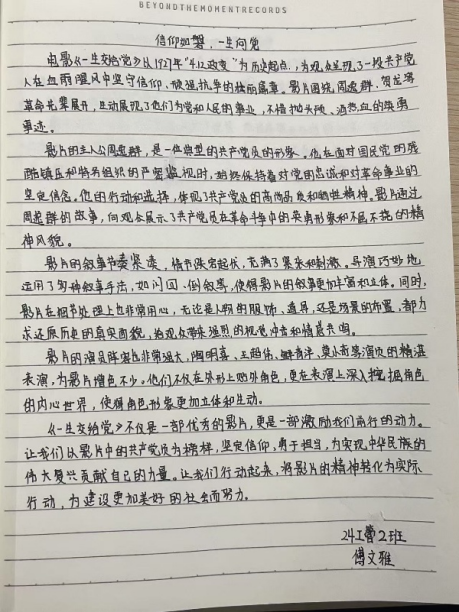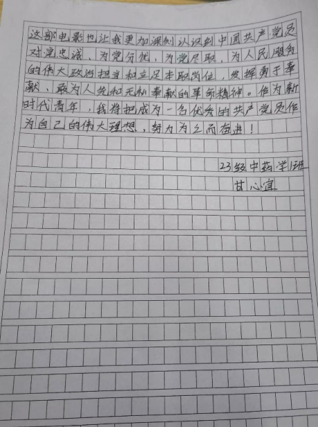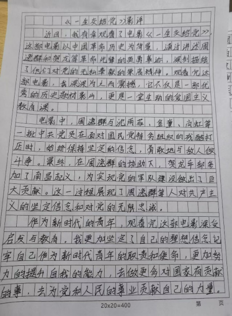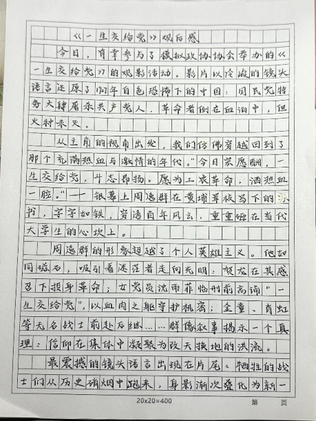 观影结束后,参加观影活动的成员不仅纷纷写下观影感受,更积极投入到影评作品的创作中。一篇篇影评作品或激情澎湃,或深情款款,不仅表达了对革命先辈的崇高敬意,也展现了新时代青年学子对红色精神的深刻理解和传承决心。