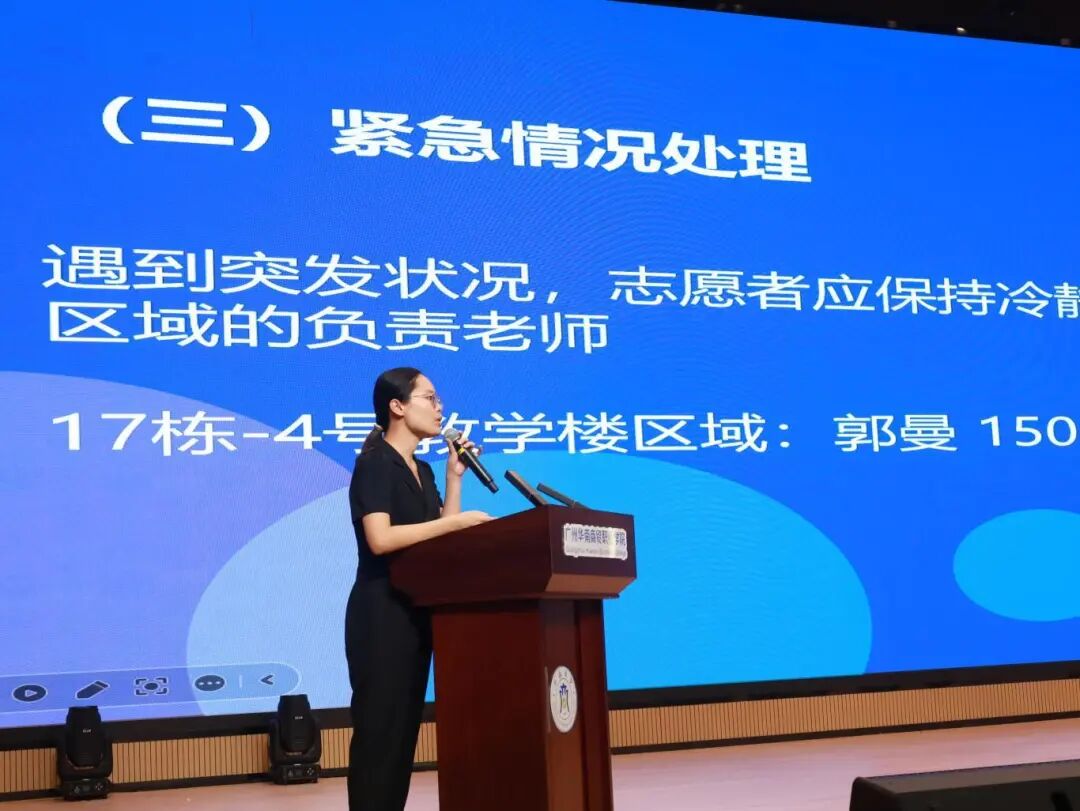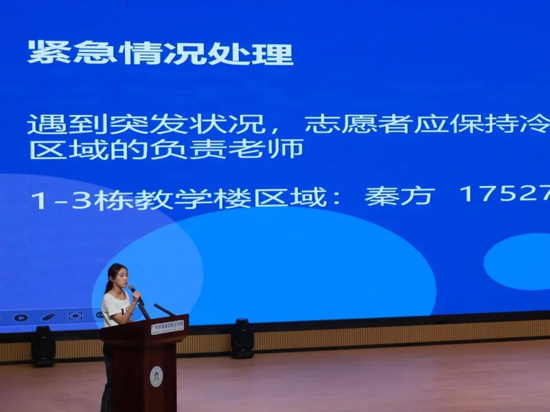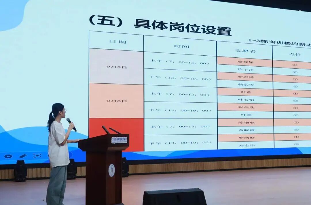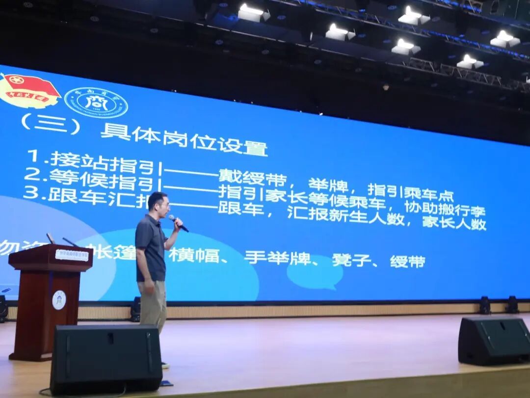 卢老师详细介绍了今年迎新工作的整体规模、特点以及工作要求,强调了迎新工作是新生认识学校的重要窗口,也是展示我校学子良好风貌的宝贵机会。她希望全体志愿者能深刻认识到自身工作的价值,以最饱满的热情、最周到的服务、最良好的形象,高质量地完成各项任务,让新同学感受到家的温暖,也让家长放心满意。
