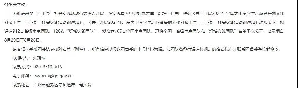 为推进暑期“三下乡”社会实践活动持续深入开展,在实践育人中更好地发挥“灯塔”作用,根据《关于开展2021年全国大中专学生志愿者暑期文化科技卫生“三下乡”社会实践活动的通知》、《关于开展2021年广东大中专学生志愿者暑期文化科技卫生“三下乡”社会实践活动的通知》要求,我校团委 “星火传承实践队”积极开展活动, 并被评选为省级重点团队。