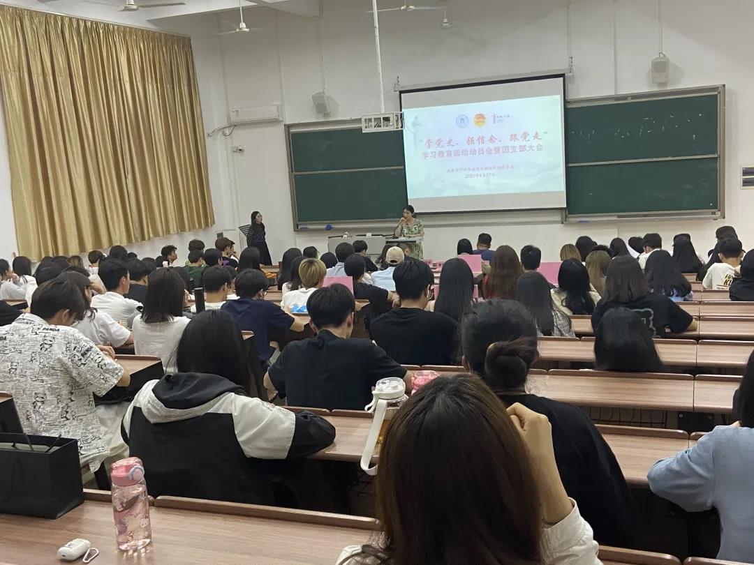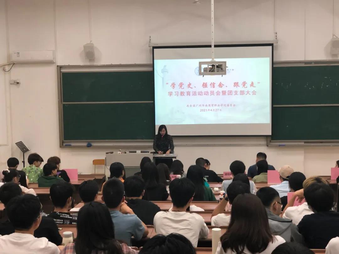 为贯彻落实习近平总书记在党史学习教育动员大会上的重要讲话精神,用实际行动诠释“党旗所指所指就是团旗所向”,推动我校各级团组织开展“学党史、强信念、跟党走”学习教育活动,及加强组织全体团员学习“青年大学习”线上主题团课,于4月27日晚在教学楼2-101室召开了“学党史、强信念、跟党走”学习教育活动动员会暨团支部大会。校团委王晓璇书记、新商务管理学院党总支申海波书记、校团委黄海玉副书记、校团委谭晓晴老师、各二级学院团委书记、校院两级宣传部学生干部代表和全体团支书,共约150人参加。