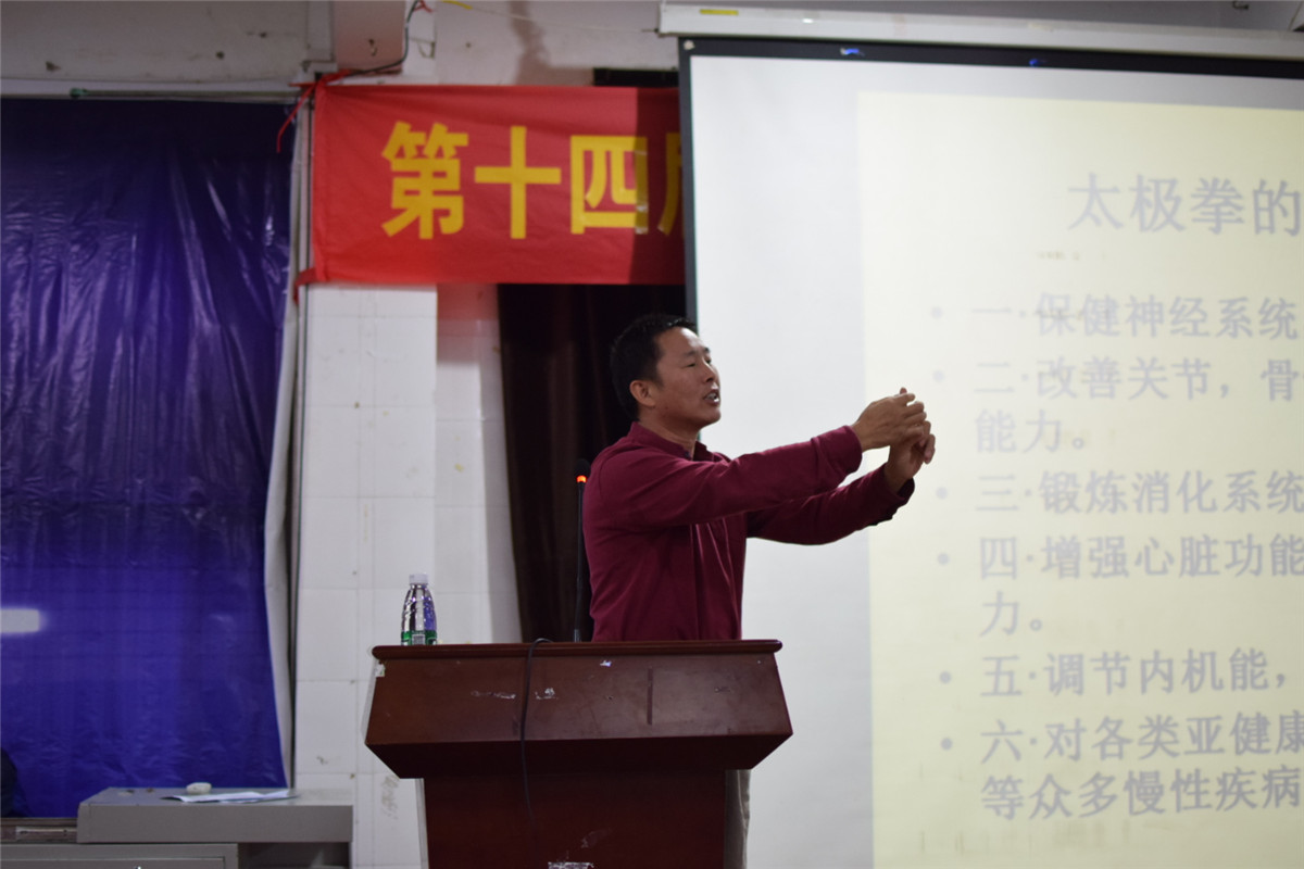 张晓武老师首先介绍了传统太极拳的由来,并倡导全民健身、全民健康服务的理念。他说:“练太极拳能够对人的寿命、安全、健康有益”,他指出一个近年来广为普遍的现象“低头族”“焦虑”,而修练太极拳能够缓解低头玩手机带来的颈椎酸痛,还可以治愈现代社会中人们的浮躁之气进而达到调节神经系统,活络筋骨疏通身心愉悦的疗效。更重要的是,学习太极拳还有很多好处,例如:它不受年龄的局限、不受场地的限制。因此,他倡导的太极拳是老少皆宜,有益身心。