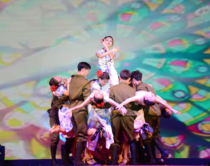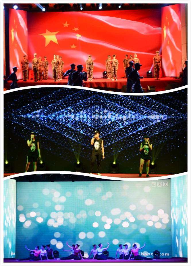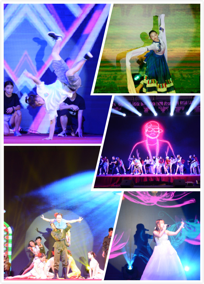 2017级新生们表演了整齐划一、激情昂扬的军体拳。各系部及舞蹈社、声乐社等学生社团相继表演了小品《新学期》、艺术体操《艺·心》、歌曲对唱《青花瓷》、街舞《Follow my dance steps》等精彩的节目。
