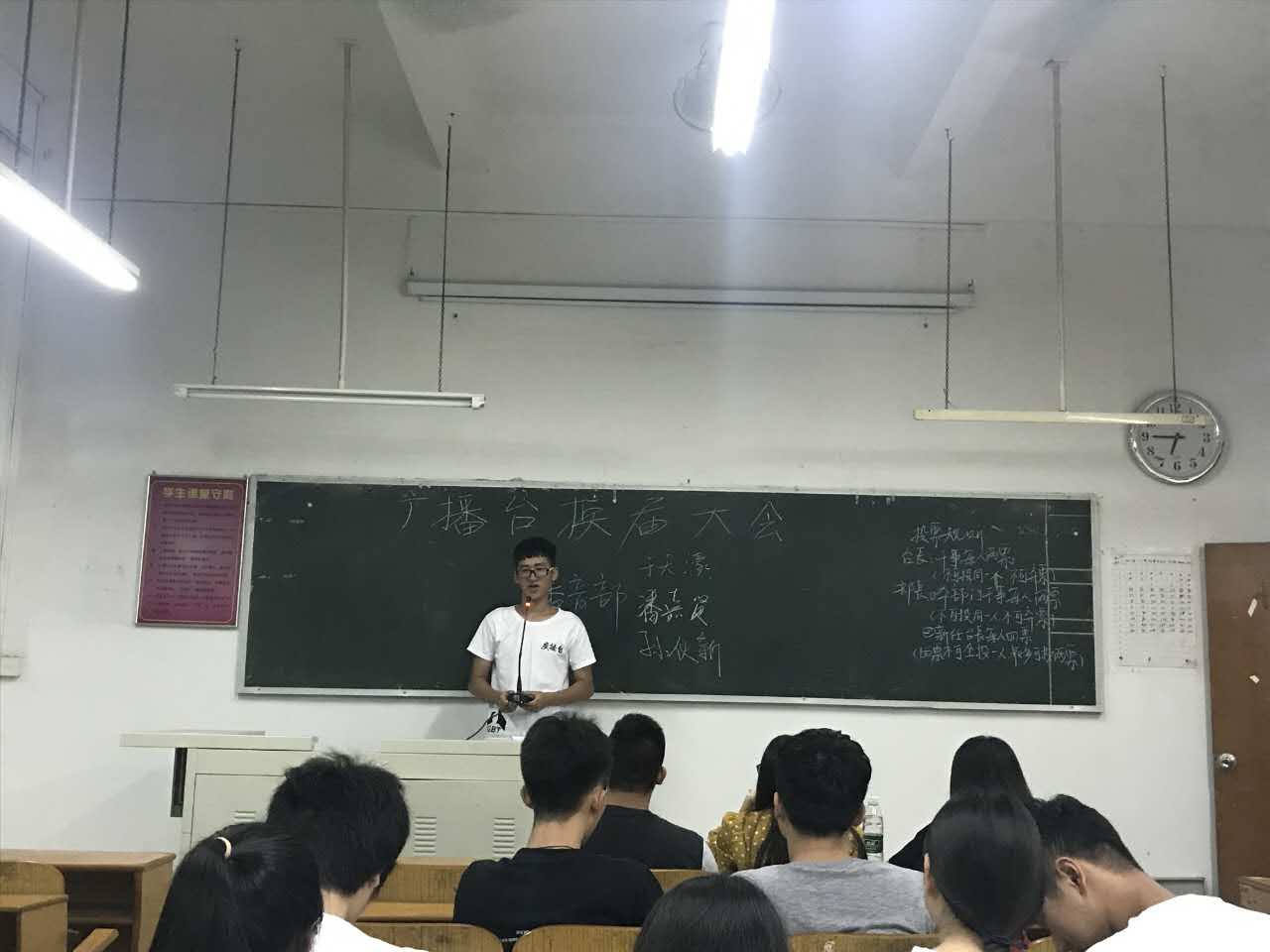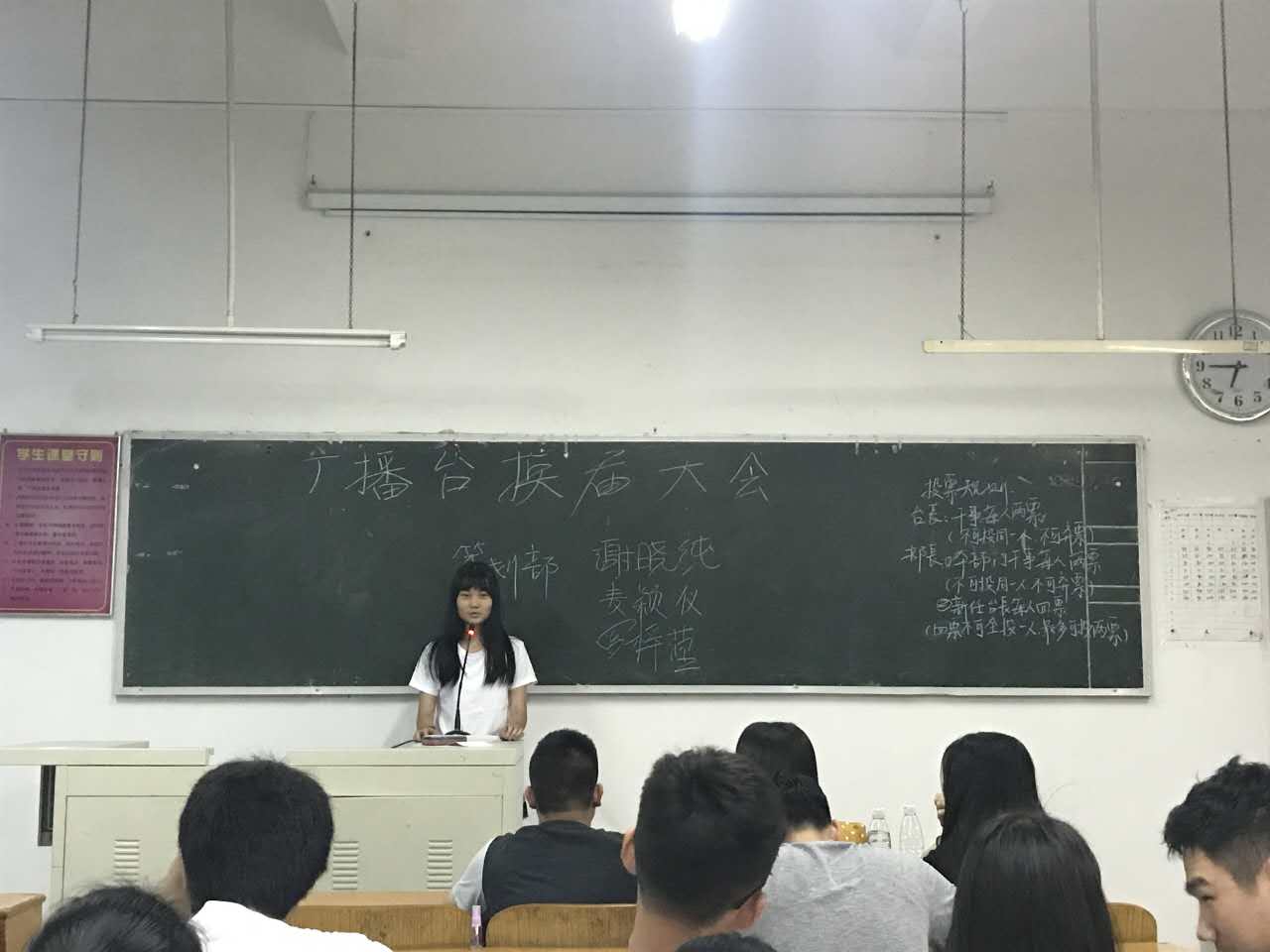 6月6日下午6:00,广州华南商贸职业学院广播台换届竞选大会在本校教学楼102教室如期进行。团委张琪老师、15届的9位台委以及16届的多名干事出席了此次大会,会议由15届播音部副部长李凤清主持。