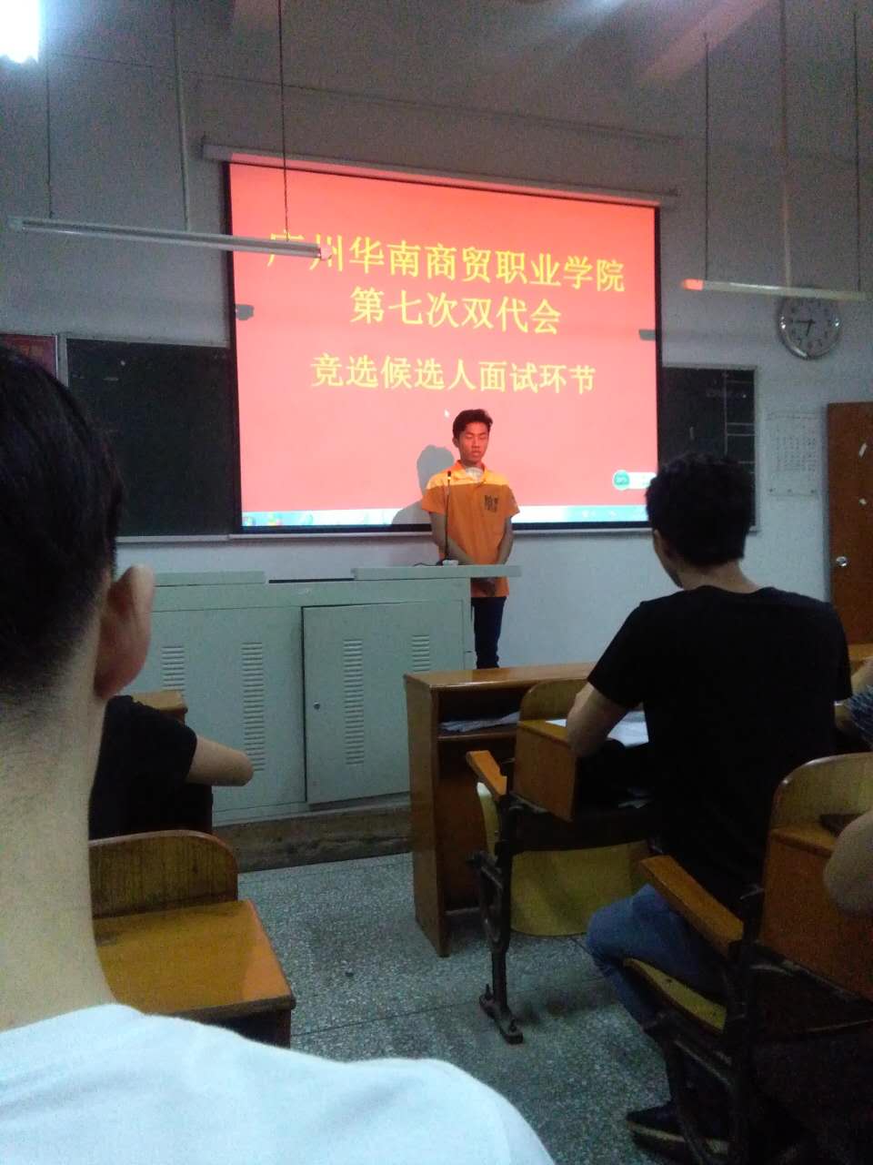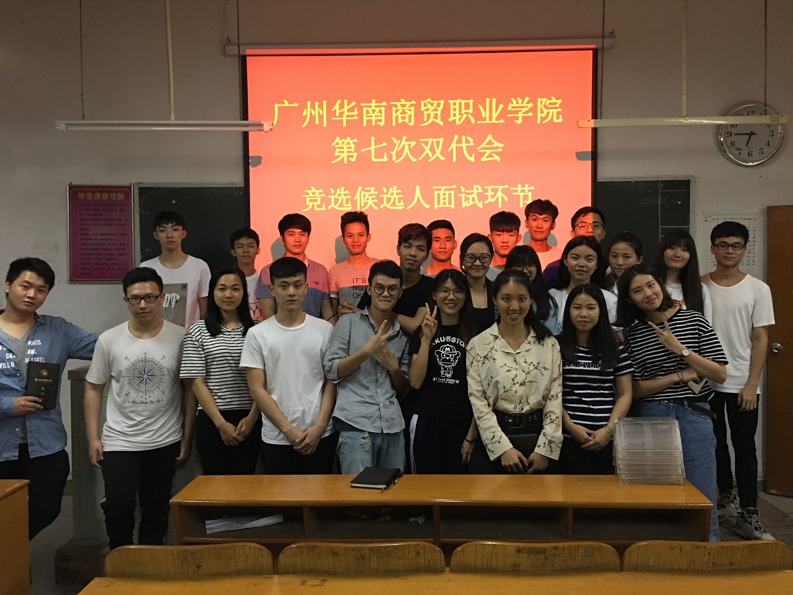 我院第七次共青团代表大会暨学生代表大会即将召开,此次将秉着公平、公开、公正的原则对竞选候选人进行选举,选举过程分为考核、面试和笔试等环节。2017年5月11日晚上18点, 院团学在教学楼101,102教室召开了广州华南商贸职业学院第七次双代会竞选候选人面试。院团委段书记、张琪老师、院团学各部门负责人以及大一的新代理参加了此次大会。