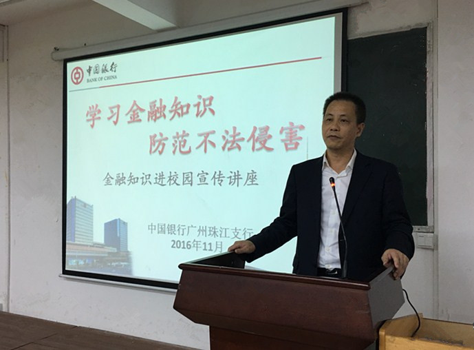 讲座伊始,由中国银行广州珠江支行内控合规中心梁日春主任致辞,介绍目前社会中存在的金融相关的状况,以及金融风险和其负面影响,提醒学生要重视网络金融的安全问题,保护自身利益。紧接着由中国银行广州珠江支行个人金融部区光耀经理就金融的详细案例,按出借身份证和银行账户、电信诈骗、校园贷、个人征信等四个主题进行分析和讲解,所举的例子与我们生活密切相关的,同学们都非常认真地听讲,踊跃参与了互动。