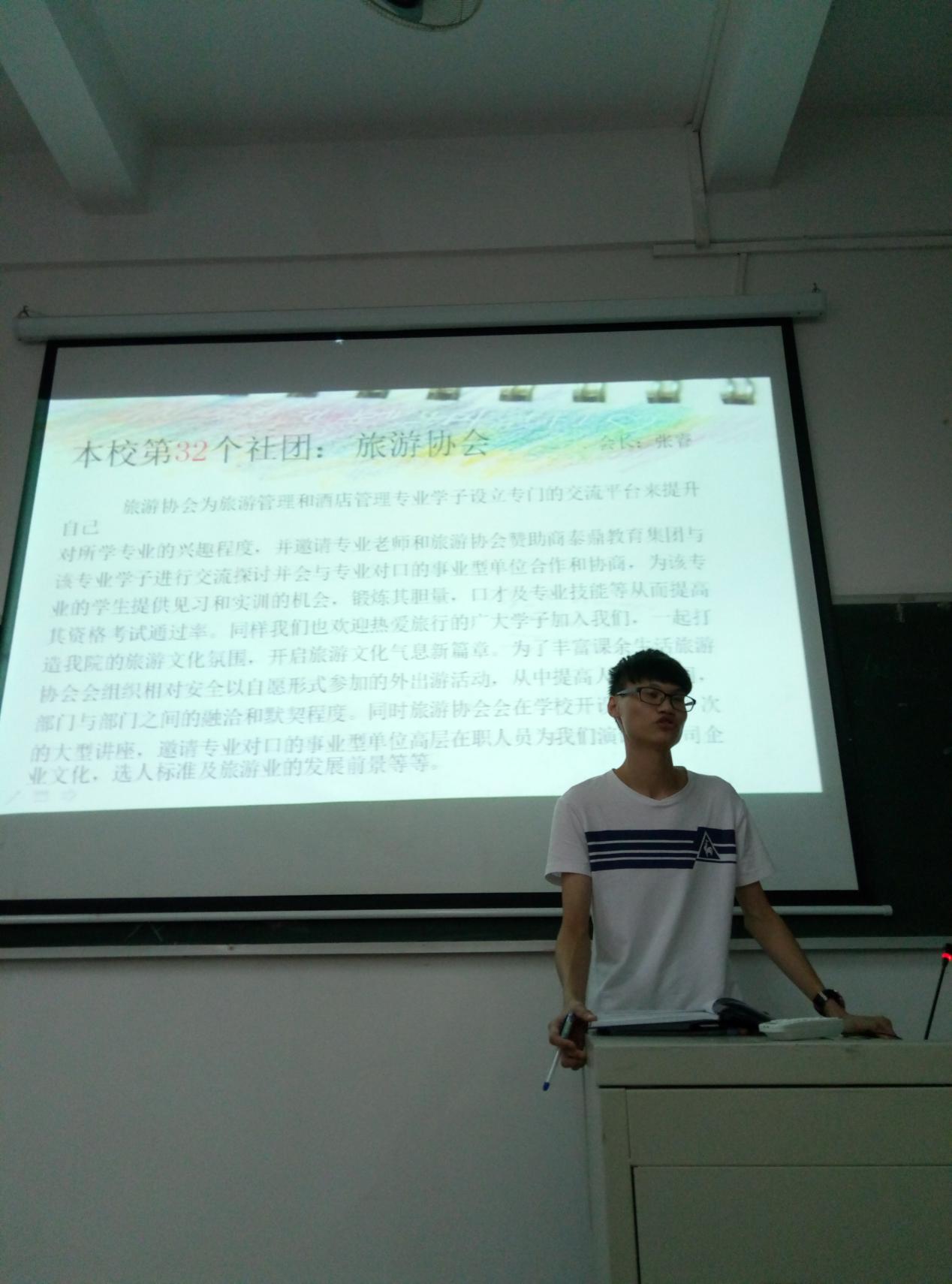 大会由社联主席刘鹏鑫主持。大会伊始,社联主席和部长们介绍了社联的各部门的职能,详细说明日常社团事务,如申请课室、物资以及归还等问题。另外还特意介绍了学院的新社团——旅游协会。