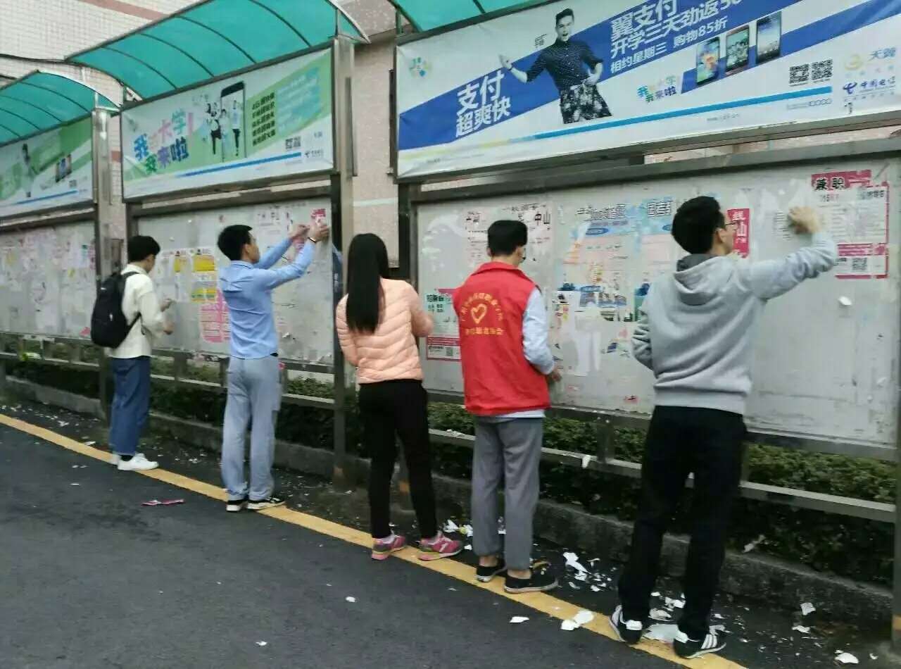 为加强我院学子的主人公意识,增强师生的校园归属感,着力构建绿色环保校园,在学院团委的精心组织和各系团总支的积极响应下,2016年3月15日,由院团委青年志愿者协会携手各系志愿者在本校区和西校区同步开展清除校园“牛皮癣”活动。