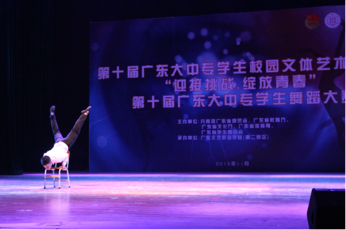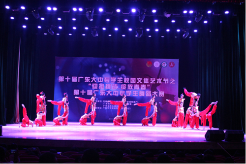 第十届广东大中专学生舞蹈大赛第二赛区比赛于2015年11月21日在广东文艺职业学院举行。此次大赛由共青团广东省委员会、广东省教育厅、广东省文化厅、广东省体育局、广东省学生联合会联合举办。在我院相关领导的支持下,由院团委组织校内筛选赛,推出独舞《骆》与群舞《龙啸》,共24人参加高校第二赛区业余组比赛。